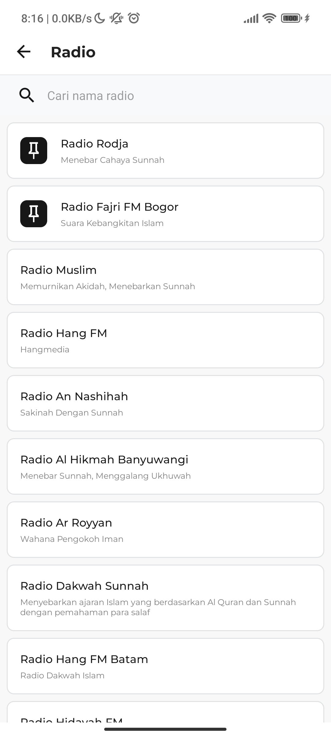 📻 Radio Islam: Akses siaran radio Islami seperti Rodja, Fajri, dan Hang FM.